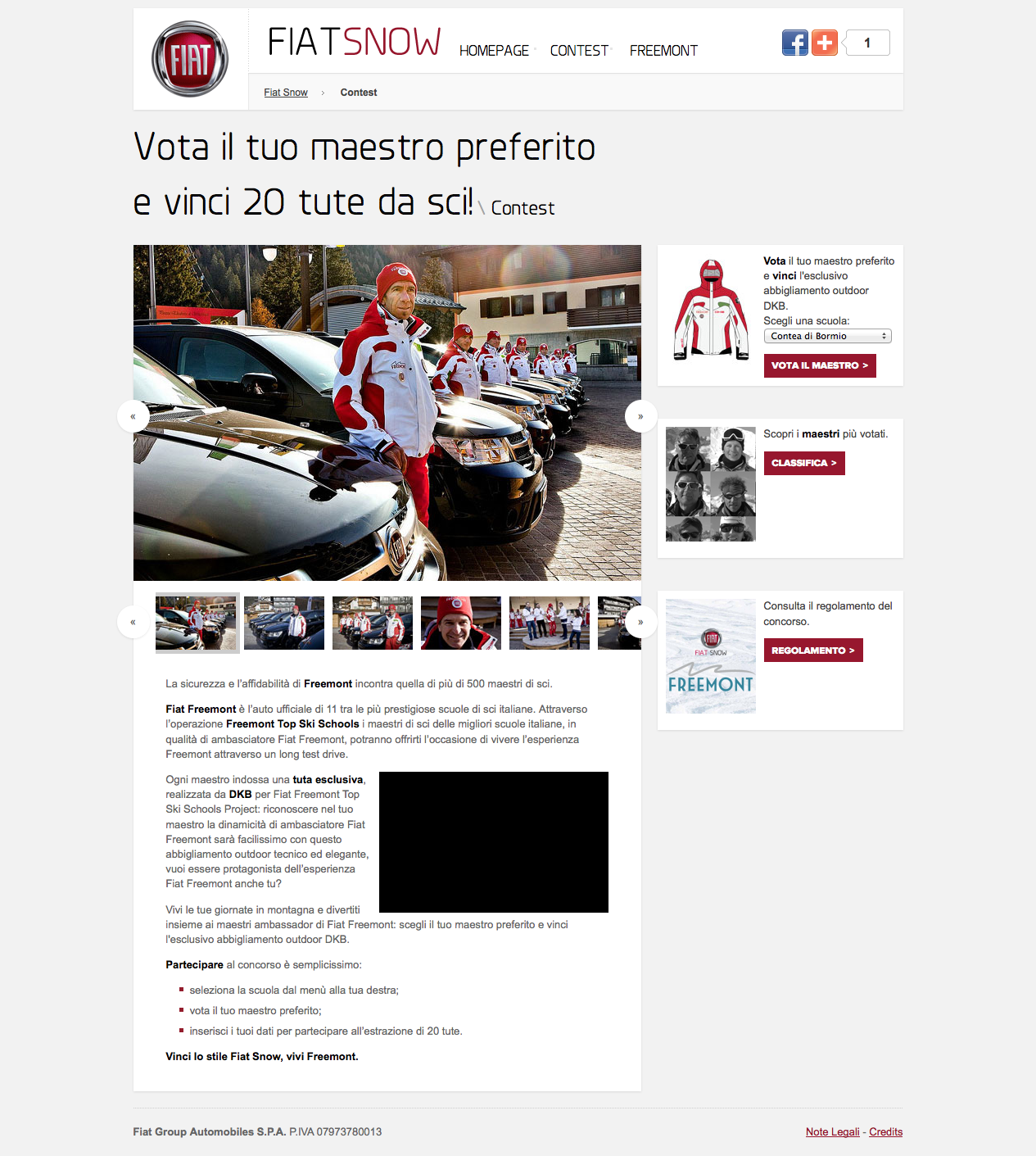 Nella home page del sito Fiat Snow (realizzato dall’agenzia Domino) il visitatore è accolto da una mappa con indicata la posizione delle 11 località interessate dall’iniziativa. È sufficiente cliccare sul nome di ognuna per trovare informazioni dettagliate sul comprensorio – con le cartine scaricabili di tutte le piste – sulla scuola di sci e sui maestri, con una pagina speciale in cui compaiono le loro foto. Inoltre, è attivo un concorso che coinvolge proprio gli istruttori: è sufficiente votare quello preferito per poter vincere una delle venti tute da sci Freemont Top Ski School Project messe in palio. Il concorso termina il 23 marzo e l’estrazione dei venti vincitori avverrà entro il 27 aprile.