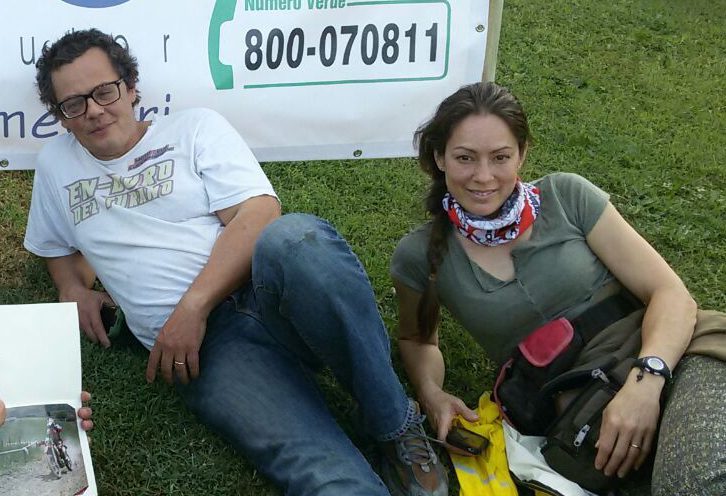 “Ed eccoci scambiare due chiacchiere nel cortile del bellissimo castello medievale di Nocciano, dopo aver recuperato le moto dal parco chiuso e mentre stiamo in attesa della chiamata per la partenza. I numeri di gara ci sono stati assegnati in deroga al solito metodo che si basa sui precedenti conseguimenti sportivi, che normalmente vede assegnare il numero minore a chi ha maggiore anzianita’ di agonismo e/o punti classifica. Quindi con logica forse inversa, a Cristina va il 753, a me il 752, mentre a Camilla viene assegnato il 751.