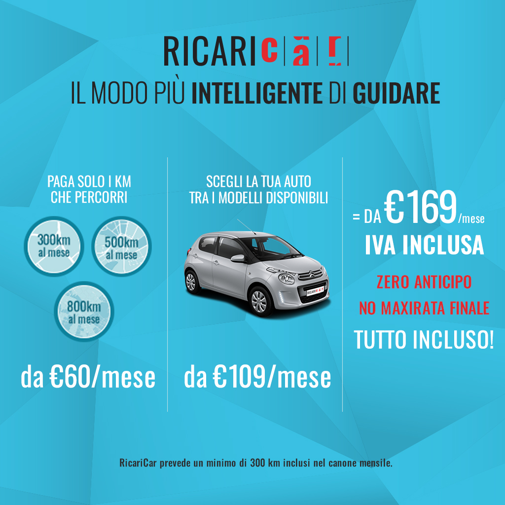 RicariCar si presenta come la prima formula che unisce le caratteristiche migliori del car sharing (personalizzazione del costo legato all’effettivo utilizzo; supporti digitali per la migliore esperienza d’uso…) ai vantaggi tangibili del noleggio (disponibilità esclusiva e costante del veicolo su tutto il territorio nazionale; assicurazione, manutenzione, bollo e tutti i servizi inclusi…).