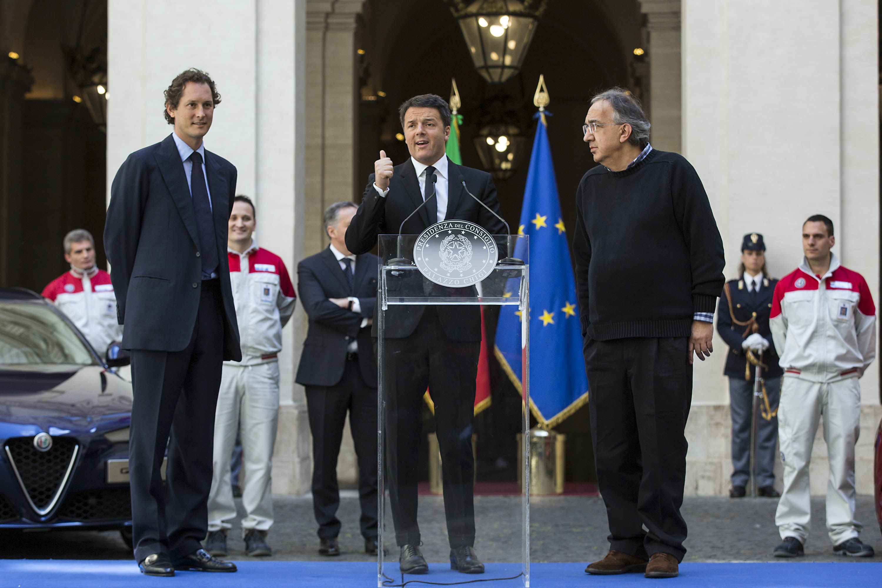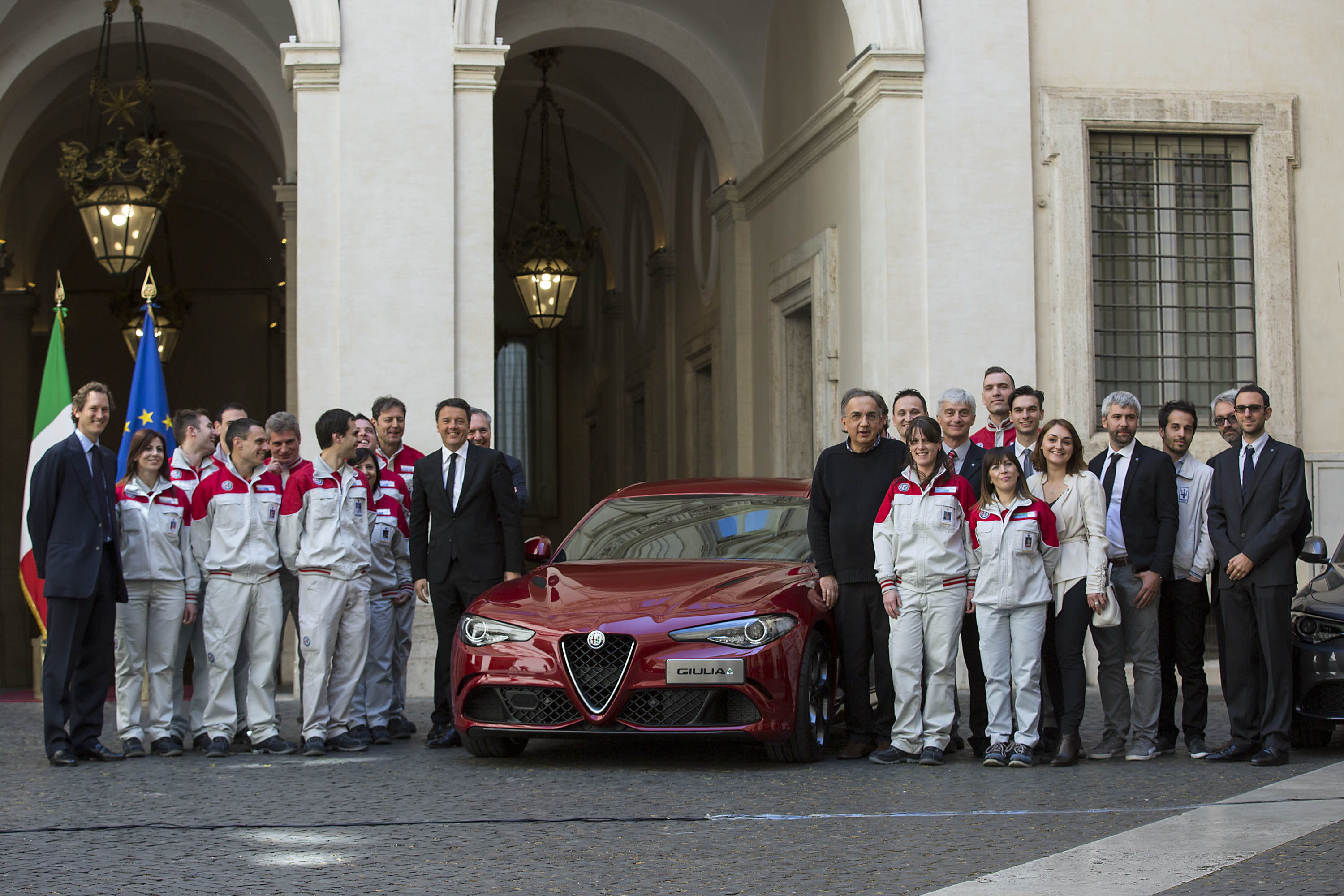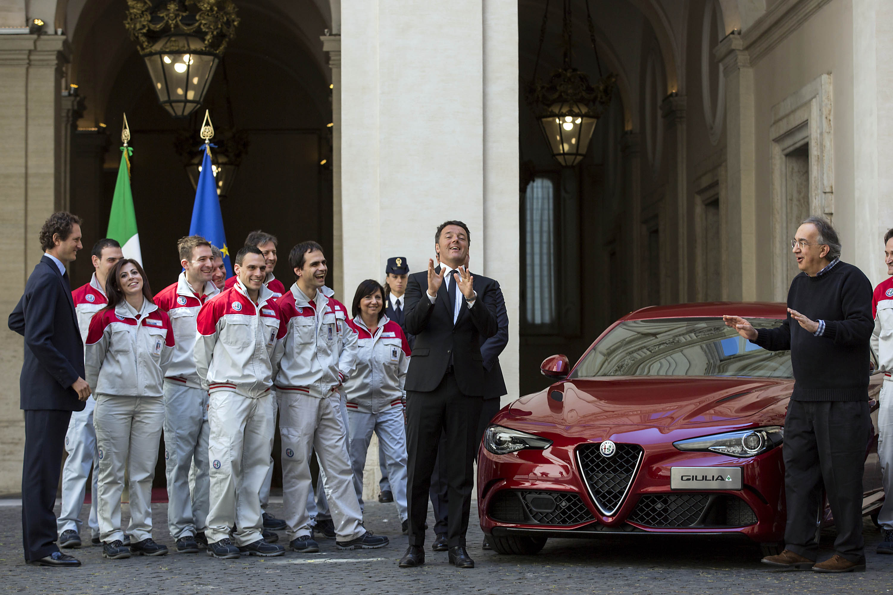 Sergio Marchionne e John Elkann presentano la nuova Alfa Romeo Giulia a Sergio Mattarella e a Matteo Renzi