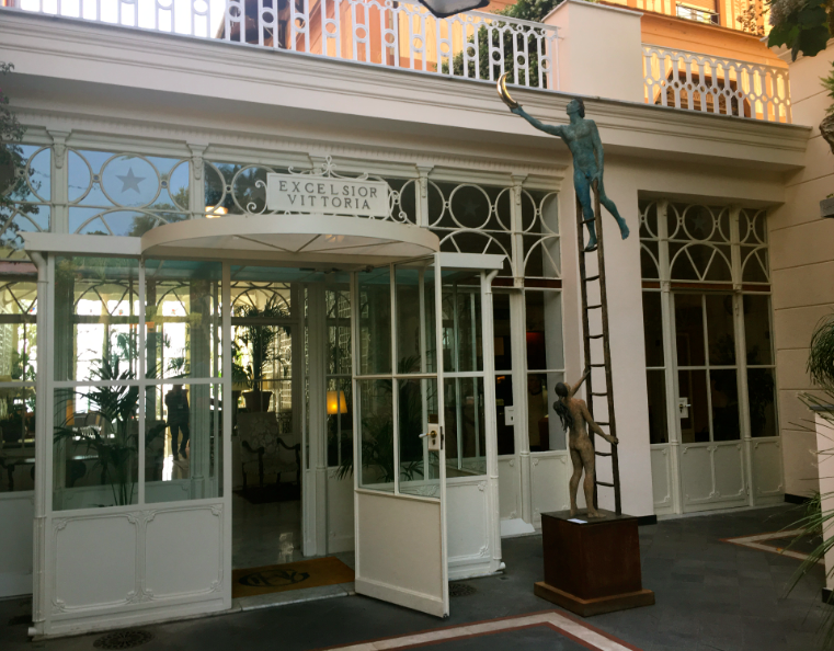 E’ quasi sera e la nostra destinazione finale è Sorrento una lunga striscia di terra protesa verso il mare e l’isola di Capri, con i suoi inconfondibili faraglioni, una città da cartolina. Per godere del tramonto decidiamo di fermarci in un luogo dal fil rouge che lega presente passato e futuro … la terrazza del Grand Hotel Excelsior Vittoria. Set di importanti produzioni cinematografiche internazionali, fra gli ospiti più famosi ricordiamo Wagner, Enrico Caruso, Jack Lemmon, Marylin Monroe, Luciano Pavarotti, Sophia Loren e Lucio. Si tratta di un maestoso hotel in stile classico, affacciato su un alto costone tufaceo dove nelle si gode una spettacolare vista del Golfo di Napoli con il Vesuvio sullo sfondo. Un tuffo nella storia di questo luogo dove si narra si trovasse la villa romana dell’Imperatore Augusto.