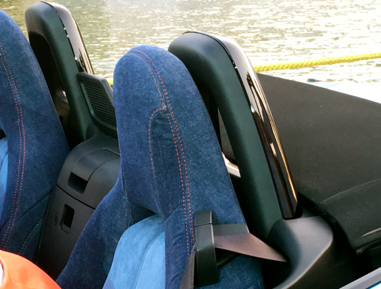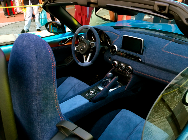 Gli interni richiamano il dualismo cromatico degli esterni con un rivestimento completo del cruscotto, dei pannelli porta e della selleria in denim giapponese, abbinato ad Alcantara nautico azzurro per le sedute (un materiale che si può tranquillamente bagnare, quindi perfettamente in linea con il concept della vettura) con cuciture a contrasto arancioni: materiali tanto giovani e pratici quanto eleganti ed inediti in campo Automotive. Completa la personalizzazione della vettura un set di cerchi da 17”, Diamond Cut, “Design 66” della linea di accessori originali Mazda.