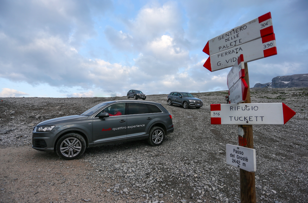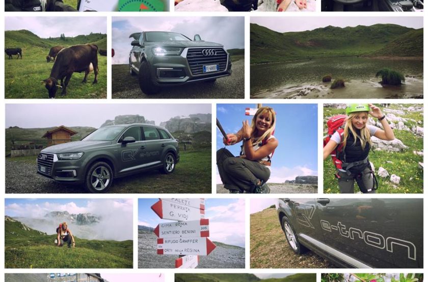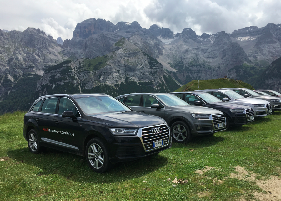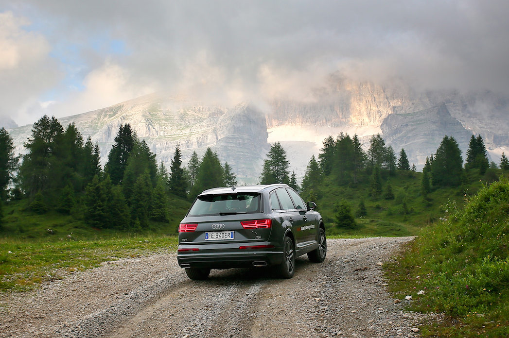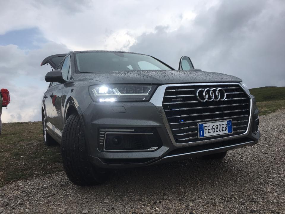 La pace ci circonda, alla natura un applauso affiora tra le rocce come una stella alpina infinitamente cercata. Abbiamo messo a dura prova la nostra resistenza ma passiamo un poi anche alla parte motori che ci guida…in questa bellissima location. Le dolomiti del Brenta sono terreno ideale per testare la capacità della trazione quattro di Audi, e quindi cosa si fa?  Eccoci al volante di una Audi Q7 e-tron e si sale ad alta quota.