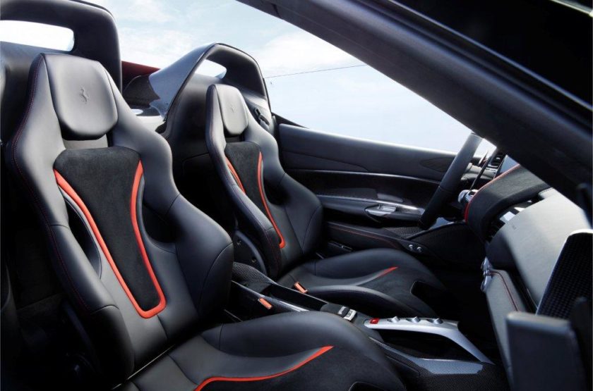 In Alcantara, inoltre, sono rivestiti elementi come la piccola consolle nel tunnel centrale dove si trova anche il naming Ferrari, e la parte superiore del cupolotto – dove ritorna l’accostamento con la pelle bicolore – compresa la palpebra che incornicia la strumentazione sportiva.