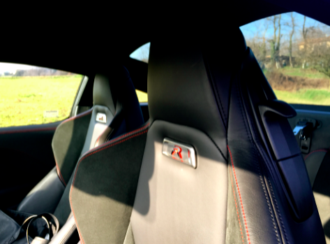 A bordo riconosciamo il suo essere “sport” dai sedili e dal materiale di rivestimento Alcantara e pelle, quella R rossa sul poggiatesta.