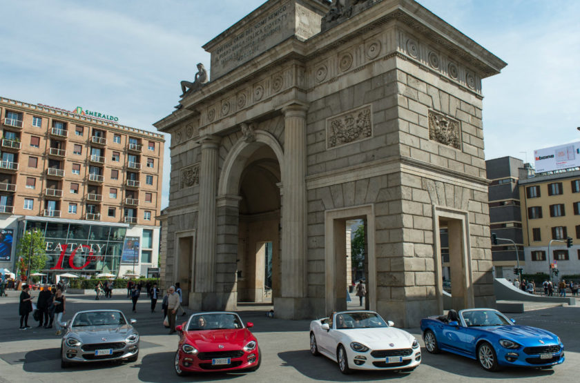 La Fiat 124 Spider sfila in questi giorni tra le vie di Milano, passerelle esclusive della 56esima edizione del Salone Internazionale del Mobile.