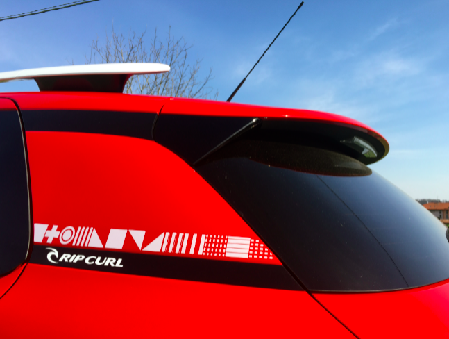 Notiamo che la parte posteriore laterale è valorizzata dal motivo Rip Curl, studiato appositamente per questo modello, e applicato orizzontalmente. Va ad aggiungersi al logo Rip Curl in bianco, con una grafica che colloca decisamente l’auto nell’universo del surf e nella ricerca dell’onda perfetta!