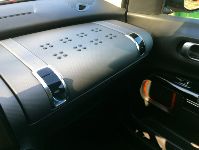 L’Airbump®, elemento di stile e funzionale che conferisce a C4 Cactus una personalità ben definita proteggendo la carrozzeria, è proposto di serie in una tinta Black e come optional in altri colori (Dune, Chocolate e Grey). All’esterno la famosa seconda “pelle” di protezione in TPU (poliuretano termoplastico) è abbinata a sticker Rip Curl, studiati appositamente per questo modello. Qui si trova sul parafango anteriore.