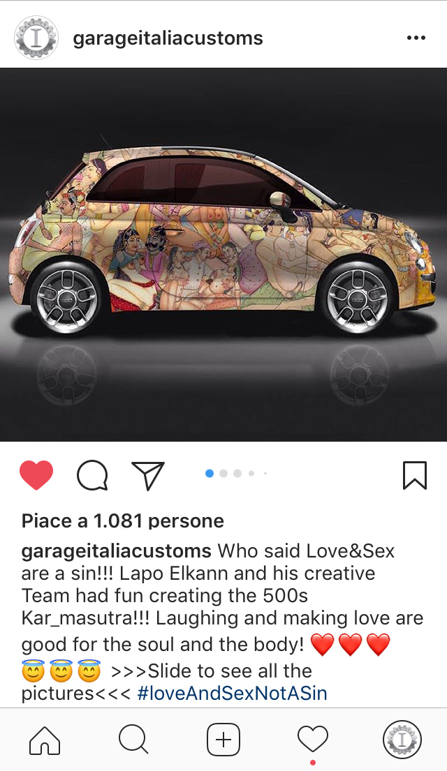 Due 500 che richiamano sulla carrozzeria le rappresentazioni artistiche del Kamasutra indiano e giapponese, censurate con rettangoli neri che scompaiono all’aumentare della temperatura esterna grazie a una speciale verniciatura termocromica sensibile al calore.