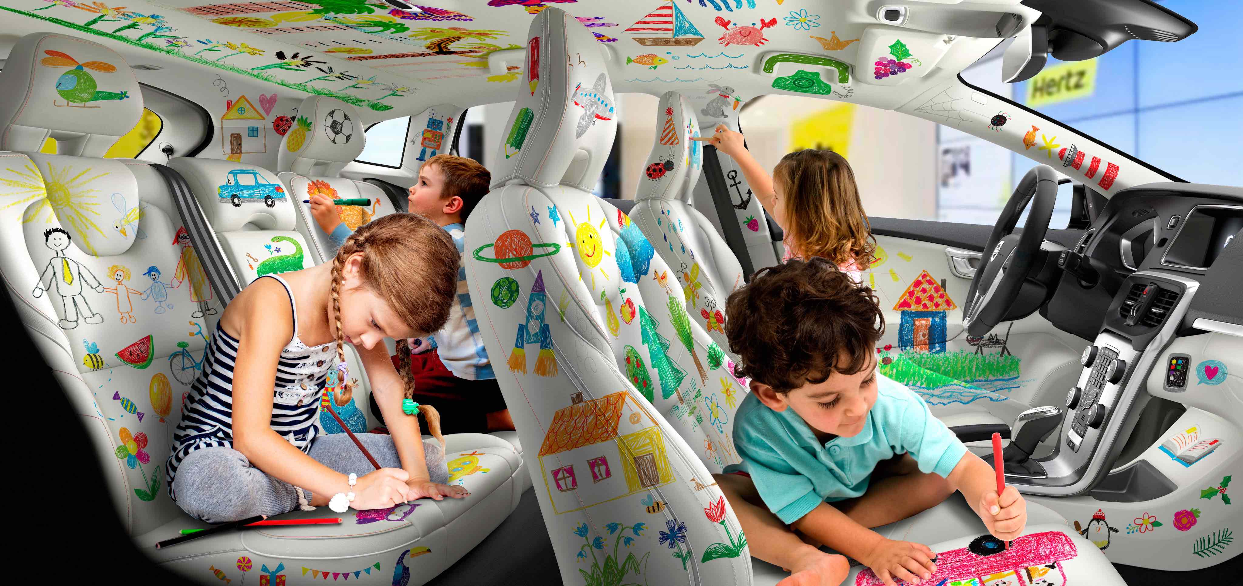 Portando il trend dei libri da colorare a un nuovo livello, Hertz ha presentato la prima auto al mondo con gli interni fatti di case, animali, fiori e, ovviamente, automobili. L’idea esclusiva è quella di un’auto interamente decorata al suo interno con simpatici disegni da colorare.