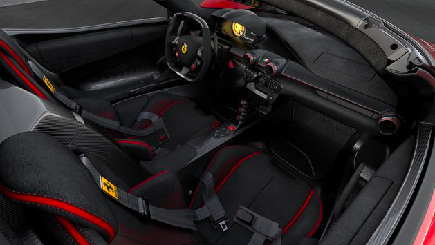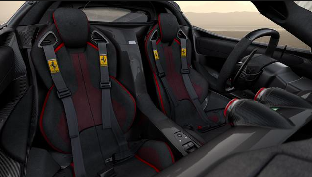Per l’asta, Ferrari ha disegnato una livrea unica in uno splendido Rosso Fuoco metallizzato con doppia striscia racing in Bianco Italia metallizzato sul cofano e sul retro. Gli interni sono stati realizzati in Alcantara nero e fibra di carbonio nero lucido, con inserti in pelle rossa sui sedili e cuciture rosse.