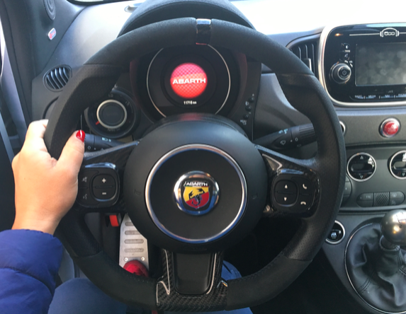 Giriamo la chiave della 595, schiacciamo il pulsante Sport ed ecco il rombo a farsi sentire da ogni parte, così come l’innesto della prima con un evidente “clack” che confer ma l’impressione di esser saliti su un’auto da corsa prestata alla strada avuta infilandoci letteralmente nell’abitacolo.