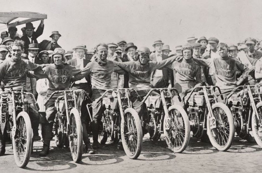 Erano i primi anni di vita del motociclismo negli Stati Uniti eppure le gare erano già un fenomeno in crescita e attiravano un pubblico sempre crescente. Un fenomeno al quale il giovane costruttore Harley-Davidson® non poteva restare insensibile (a dispetto del fatto che Arthur, uno dei fratelli Davidson nonché Presidente della Motor Company, fosse dichiaratamente contrario a un coinvolgimento in tal senso). Ma Walter Davidson non la pensava allo stesso modo e mise dunque insieme un gruppo di piloti di talento in grado di far primeggiare Harley®. Fra di essi il pittoresco Ray Weishaar, un ragazzotto dell’Oklahoma che, tra le altre cose, contribuì a imporre il nomignolo ‘hog” per le moto Harley grazie al maialino-mascotte che portava con sé e al quale faceva bere regolarmente Coca-Cola… Comunque, per Harley® i concorrenti da battere erano i due marchi Indian ed Excelsior.