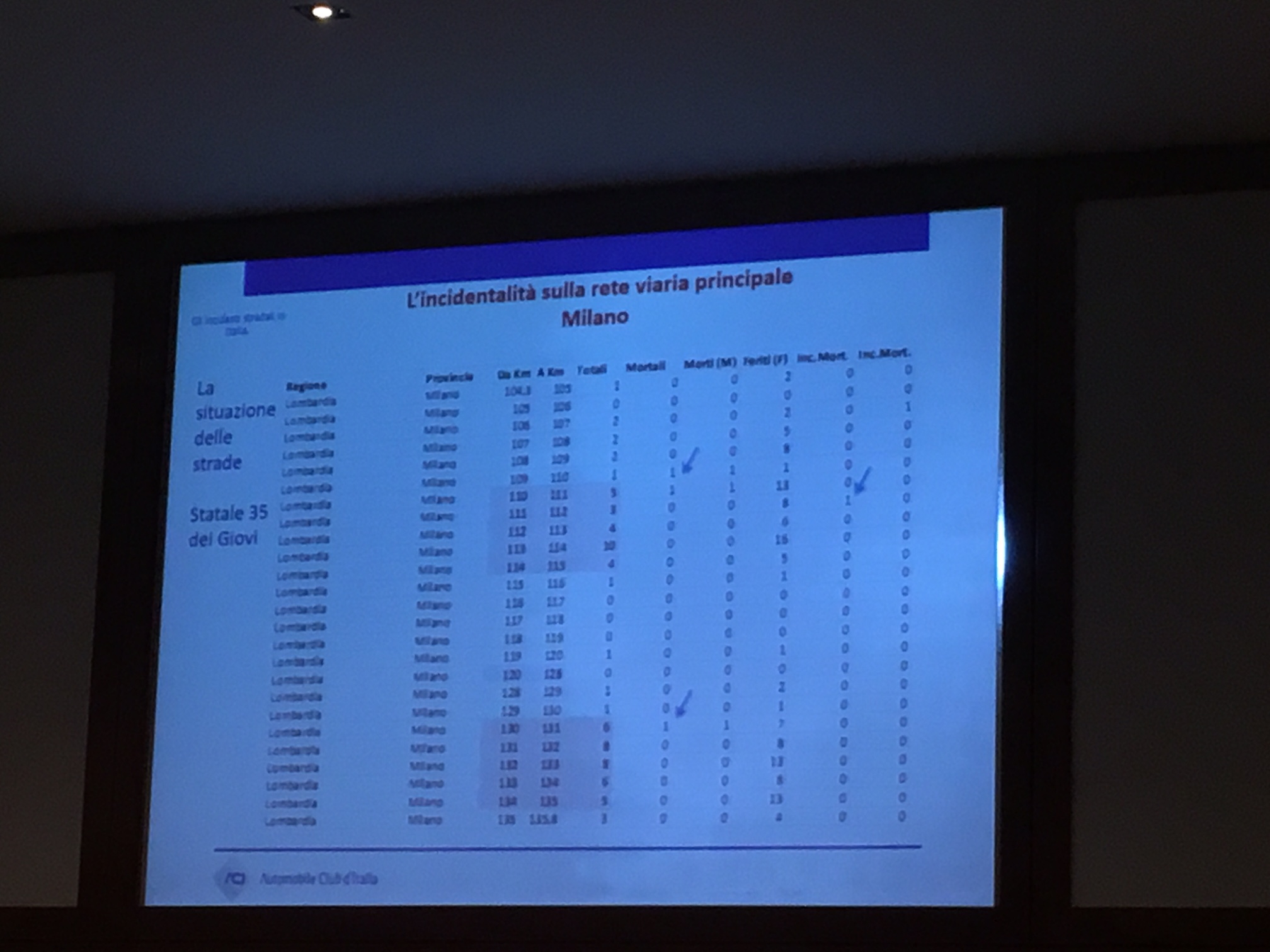 Lucia Pennisi, responsabile Area statistica dell’Automobile Club d’Italia, ha sottolineato l’importanza dell’elaborazione effettuata per localizzare gli incidenti stradali sulla rete viaria principale particolarmente utile per individuare le tratte più a rischio incidenti su cui effettuare le ispezioni. In Lombardia questa rete stradale si contraddistingue per un’alta densità di incidenti (con 1,35 incidenti per chilometro che è pari due volte la media nazionale) con un indice di mortalità pari a 2,34.