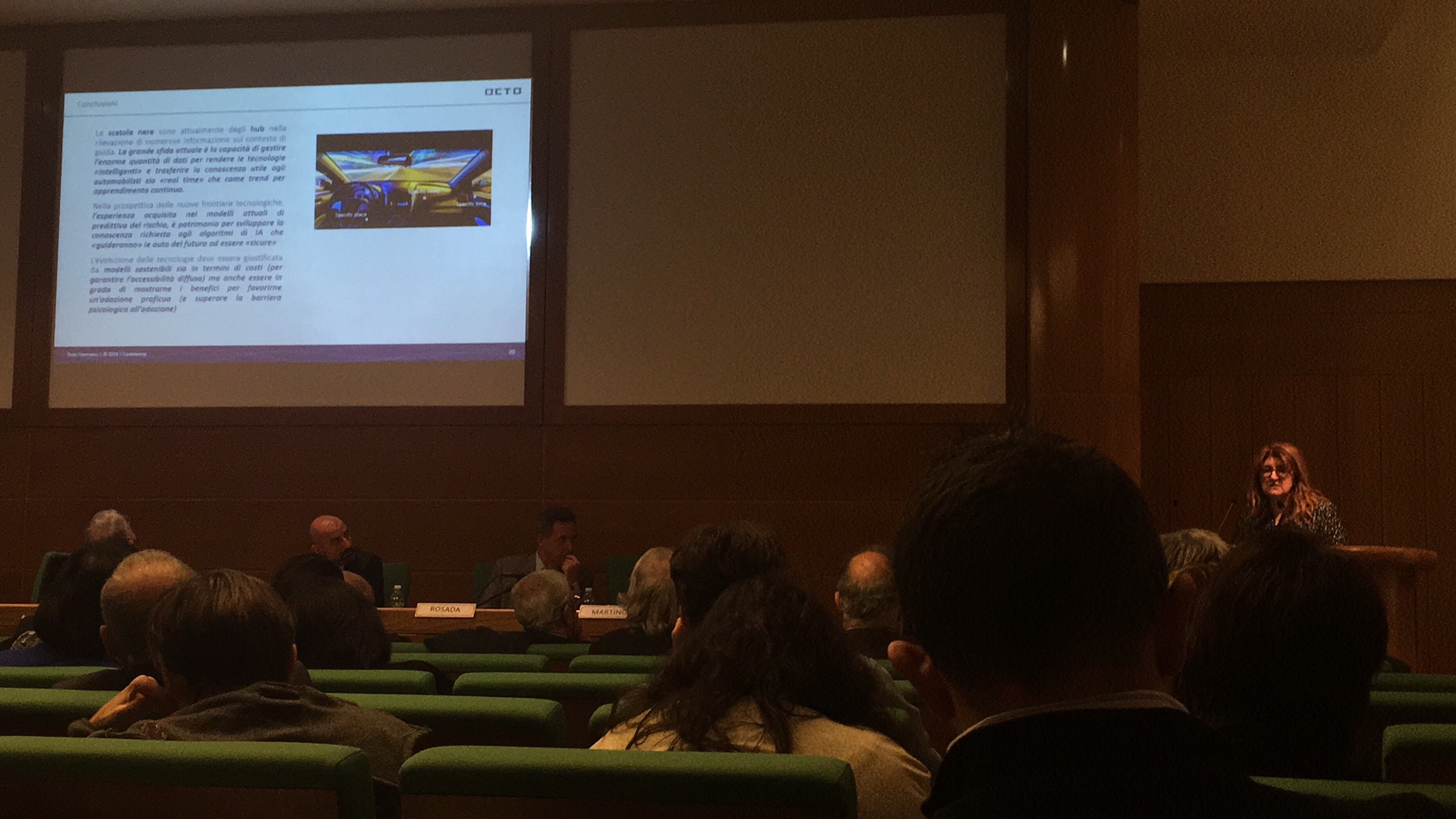 Ne hanno parlato i rappresentanti di due aziende aderenti all’ANFIA – Associazione Nazionale Filiera Industria Automobilistica: Tina Martino per Octo Telematics, Riccardo Tranquillini e Massimo Zenobi per Meta System. Sono stati illustrati, in particolare, gli sviluppi delle scatole nere evolute, approfondendo il loro apporto ad una maggiore responsabilità individuale e collettiva.