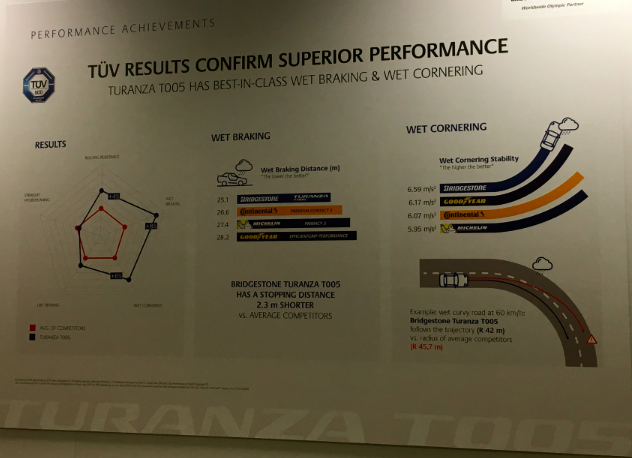 Nei test condotti da TÜV SÜD il Turanza T005 ha ottenuto le performance migliori nell’aderenza laterale e in frenata sul bagnato.Anche per quanto riguarda l’etichettatura europea del pneumatico Turanza T005 ha ottenuto risultati ai vertici del segmento con A per distanza d’arresto sul bagnato e B per la bassa resistenza al rotolamento.