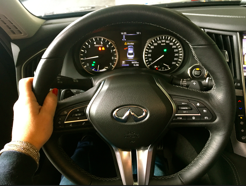 Oltre alle varie regolazioni elettriche per il volante e per i sedili anteriori, la Q50 Hybrid AWD stupisce per lo uno sterzo elettronico by wire Direct Aptive Steering (ovvero non collegato meccanicamente al volante, pur se il collegamento esiste e si attiva in casi di emergenza), ed è quindi possibile regolarne il carico attraverso lo schermo touch.