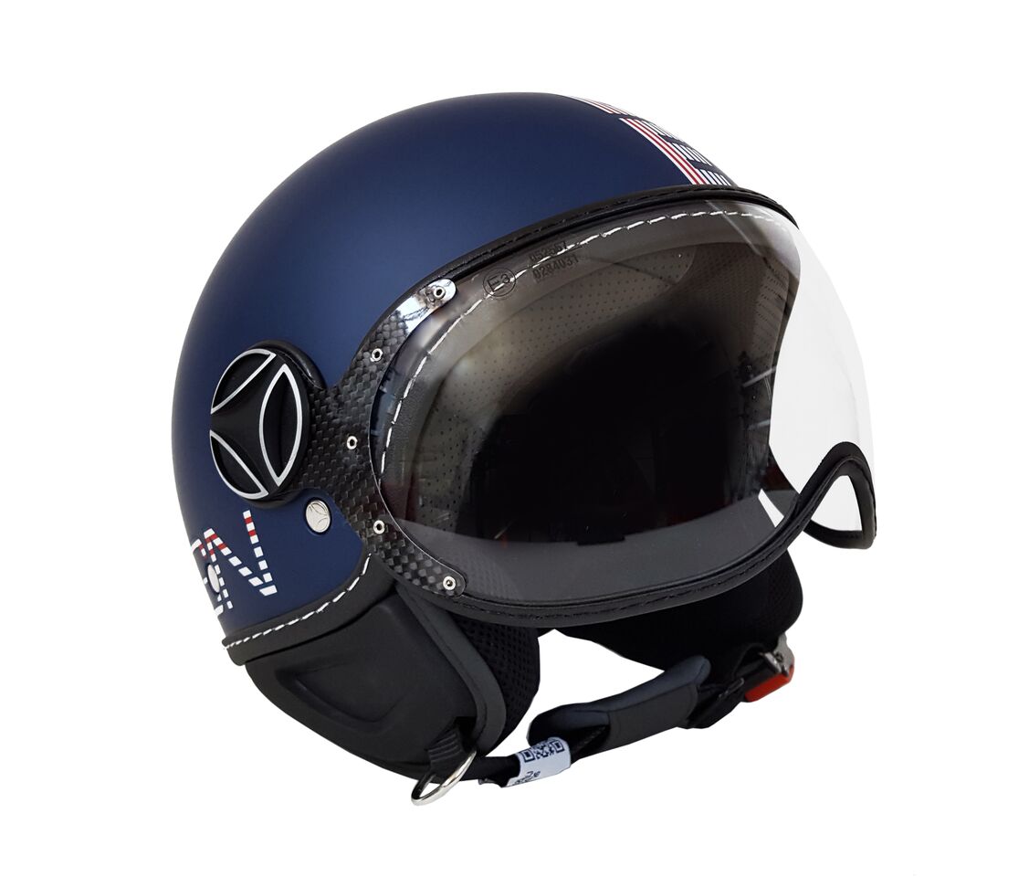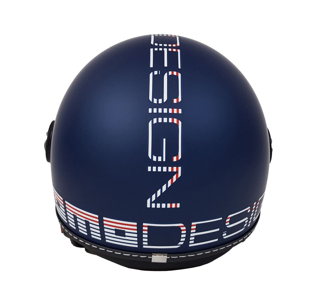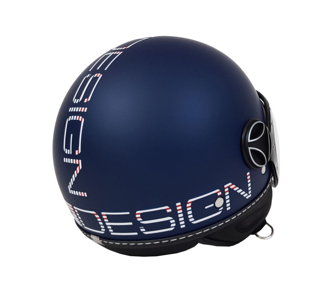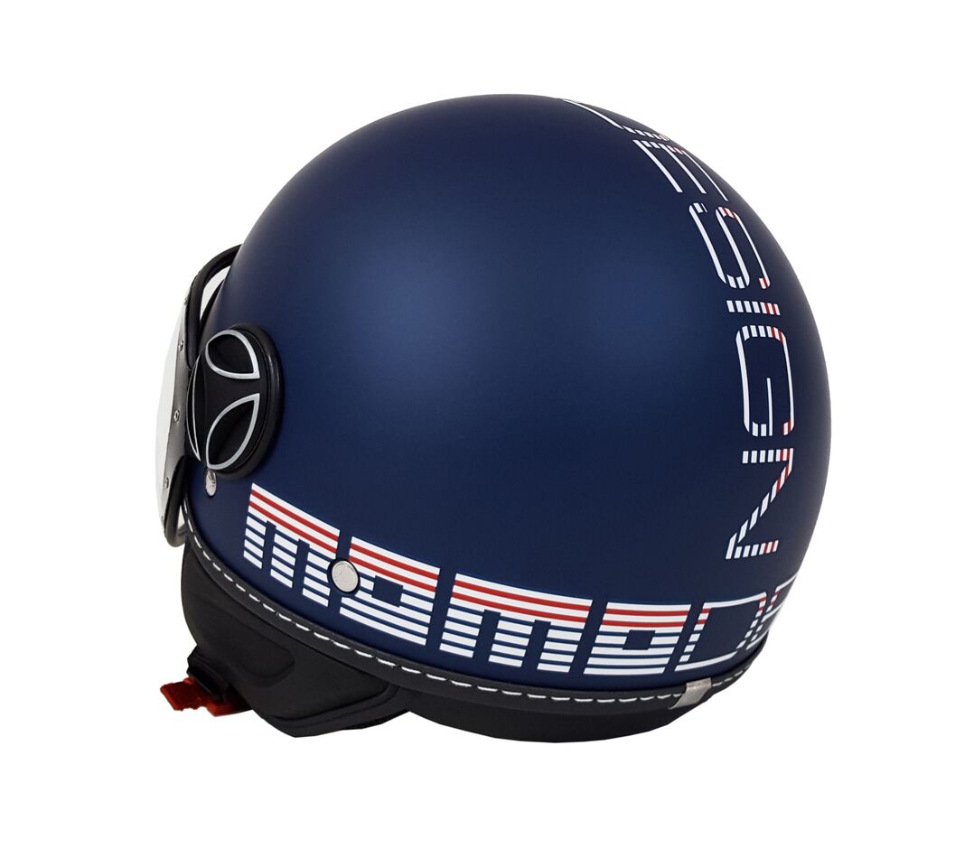 La sua particolarità, la calotta blue frost con grafica striped in versione marinière nel classico bianco, blue navy e rosso che tinge il logo Momodesign.