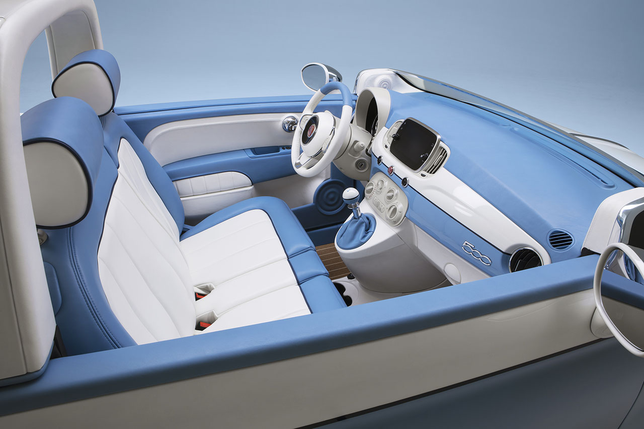 I due sedili anteriori sono stati sostituiti da una panchetta creata su misura che richiama il design tipico delle vetture degli anni ’60, impreziosita dai rivestimenti in pelle Foglizzo Leather bianca e azzurra, con trattamento impermeabilizzante. Infine le finiture cromate delle maniglie, specchietti e delle borchie dei nuovi cerchi in lega Fiat 500 Vintage 1957 fanno luccicare sotto il sole la Spiaggina by Garage Italia.