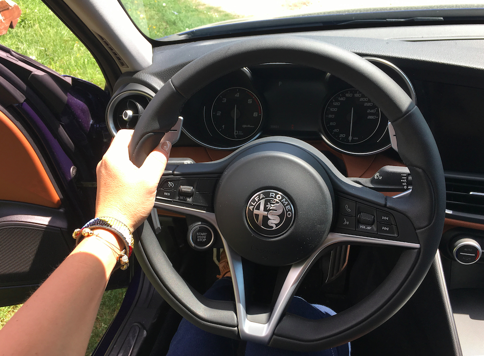 Schiacciamo con grande emozione il tasto start posto sul volante questo dettaglio è indizio della passione con la quale la Giulia è stata realizzata.