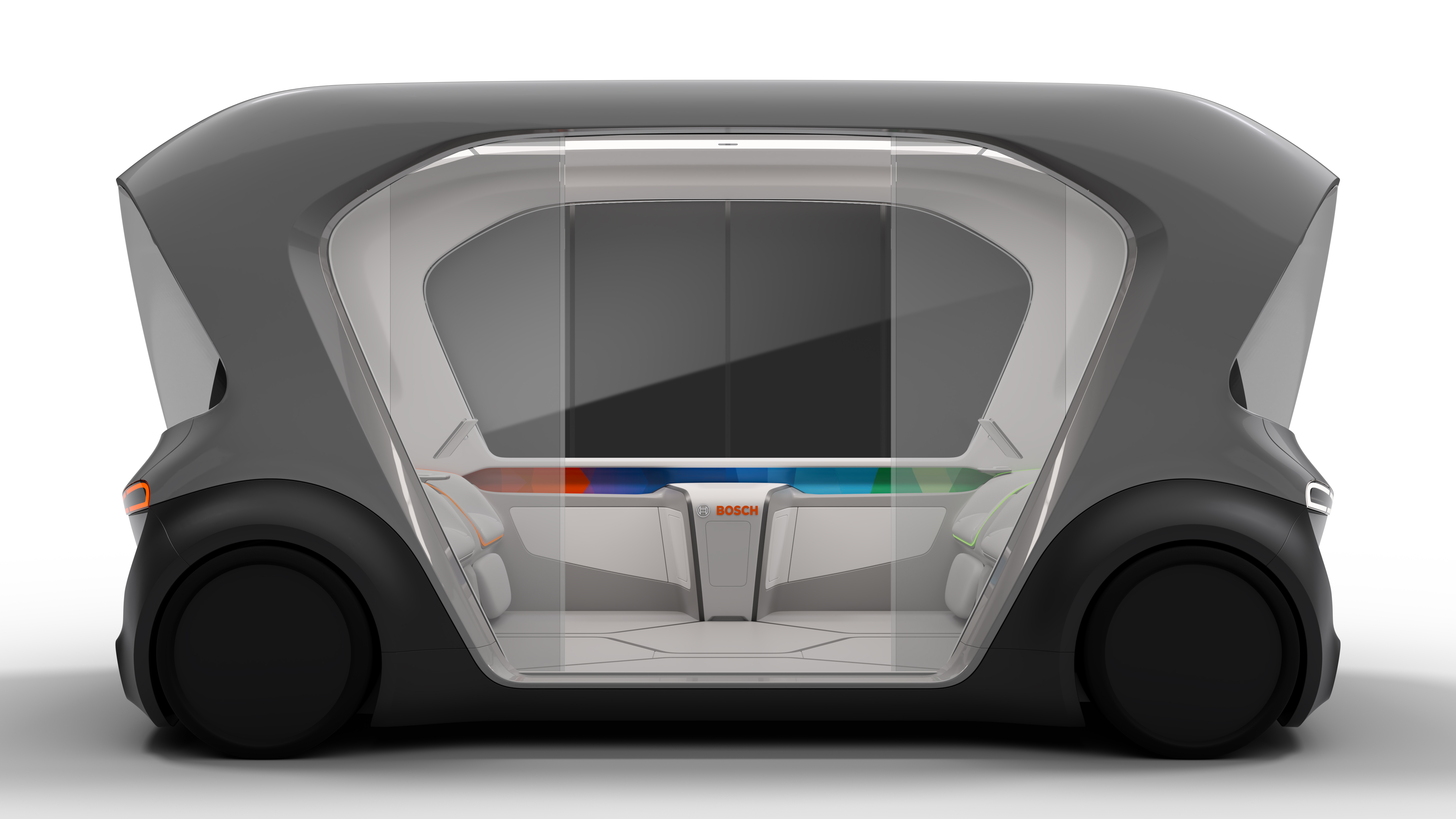 Questo prototipo è in grado di accogliere quattro passeggeri, gli uni di fronte agli altri, per ottimizzare lo spazio e garantire comodità. Gli schermi per l’infotainment possono essere utilizzati dai passeggeri individualmente o in gruppo; per esempio, una famiglia può guardare un film mentre è in viaggio per trascorrere il weekend fuori città, o dei colleghi possono lavorare ad una presentazione mentre si recano in ufficio. Gli smartphone utilizzano il Wi-Fi a bordo e possono integrarsi alla perfezione con il sistema di infotainment, grazie alla tecnologia di connettività di Bosch. Il servizio concierge trasforma lo shuttle in un assistente personale. Avendo qualsiasi tipo di informazione a propria disposizione, il veicolo può fornire ai passeggeri consigli, prenotazioni anticipate, bollettini meteo e suggerimenti di viaggio in qualsiasi momento. Quando lo shuttle arriva a destinazione, i passeggeri possono pagare il viaggio con il servizio di pagamento elettronico di Bosch.