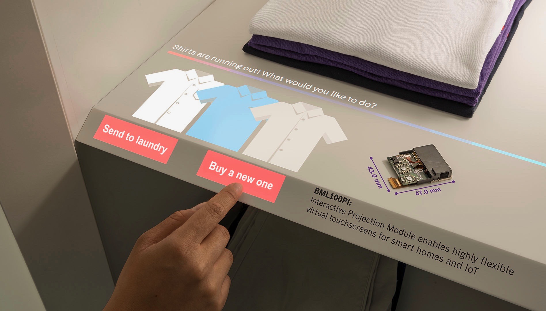 Un altro nuovo sviluppo è il proiettore PAI, che può proiettare un’interfaccia utente virtuale sul piano di lavoro della cucina. Un sensore 3D integrato acquisisce tutti i movimenti della mano consentendo l’uso dell’interfaccia come touchscreen. Gli utenti possono comodamente cercare ricette online e fare telefonate su internet mentre cucinano o sono ai fornelli. Progettato specificamente per l’ambiente della cucina, PAI si può utilizzare tranquillamente senza tutte le accortezze richieste dallo schermo di uno smartphone o un tablet. Il proiettore risponde perfettamente ai comandi in tutte le condizioni di utilizzo. PAI debutterà in Cina a febbraio 2019, prima del lancio sul mercato statunitense.
