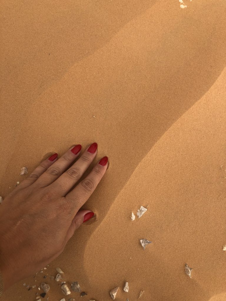 Poi, la parte che aspettavo di più, mettermi al volante della mia compagna di avventure e guidare nel deserto. Una sensazione inspiegabile di leggerezza e meraviglia quando sali una duna senza sapere cosa c’è dopo, ma vedi all’infinito questo mare di sabbia disegnato dal vento. Pista e fuori pista per sentire la sensazione sotto le mani di come reagiva il volante e per un attimo mi faccio catturare dal provare la sensazione del fuoripista, da quella sabbia non battuta, nonostante le raccomandazioni del capogruppo riguardo i cumuli di sabbia creati dal vento. Inizialmente tutto bene finché non rimango bloccata nella sabbia. Consapevole di quello che avevo fatto, con la macchina ben inclinata sul fianco sinistro, scoppio in una risata, come una bimba colta in fragrante. Una ripresa da parte di mio padre e Gaetano che tirano fuori l’auto per proseguire.