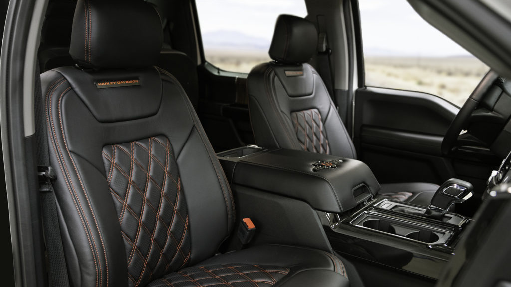 Il nuovo F-150 Harley-Davidson è disponibile in tre diverse colorazioni Agate Black, White Platinum e Abyss Grey. Agli interni è stata data la stessa attenzione riservata al look esterno, per far “vivere” fino in fondo l’essenza Harley. A cominciare dai sedili in pelle nera, utilizzando la medesima selleria delle mitiche custom, impreziositi dalle impunture arancioni a contrasto e dalla scritta Harley Davidson. Altri richiami ai colori o al mondo della Casa di Milwakee sono presenti all’interno dell’abitacolo, come la bordatura arancione della strumentazione, o lo stemma sui tappetini. La sportività è invece connotata dalla pedaliera di tipo racing. Dato che l’F-150 Harley Davidson è prodotto in serie numerata, al centro della consolle è collocato il badge con il numero identificativo del veicolo.