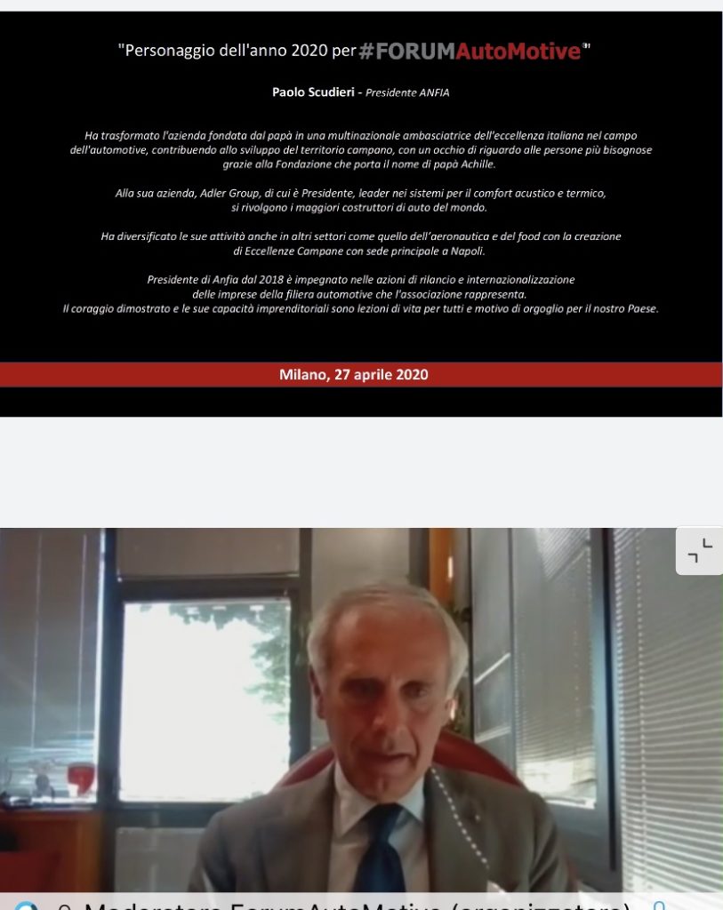Pierluigi Bonora, giornalista, promotore di #FORUMAutoMotive, motiva così la scelta: “In questa sua quarta edizione, il riconoscimento di “Personaggio dell’anno per #FORUMAutoMotive” assume un significato particolare. Con Paolo Scudieri, imprenditore e presidente di Anfia, l’associazione che rappresenta la filiera italiana automotive, il riconoscimento viene infatti simbolicamente allargato a tutte le imprese del settore automotive – piccole, medie e grandi – che rappresentano la spina dorsale del Paese e della sua economia. Saranno, infatti, proprio queste imprese, soprattutto se messe rapidamente nelle condizioni di farlo, a segnare l’auspicata ripartenza del Sistema Italia duramente provato dalla pandemia da Covid-19. Paolo Scudieri, imprenditore e presidente di Anfia, oltre ad avere una grande storia umana alle spalle e ad adoperarsi da sempre per il bene, la gente e l’immagine della sua terra, la Campania, è alla guida di un’azienda del settore automotive che fa da ambasciatrice, nel mondo, dell’eccellenza industriale italiana, uno dei simboli di quel Made in Italy che tutti ci invidiano. #FORUMAutoMotive si congratula con il presidente Scudieri e gli dà appuntamento alla prima occasione post Covid-19 per farsi raccontare la sua storia, quella della sua azienda e i tanti nuovi progetti che ha in cantiere”.
