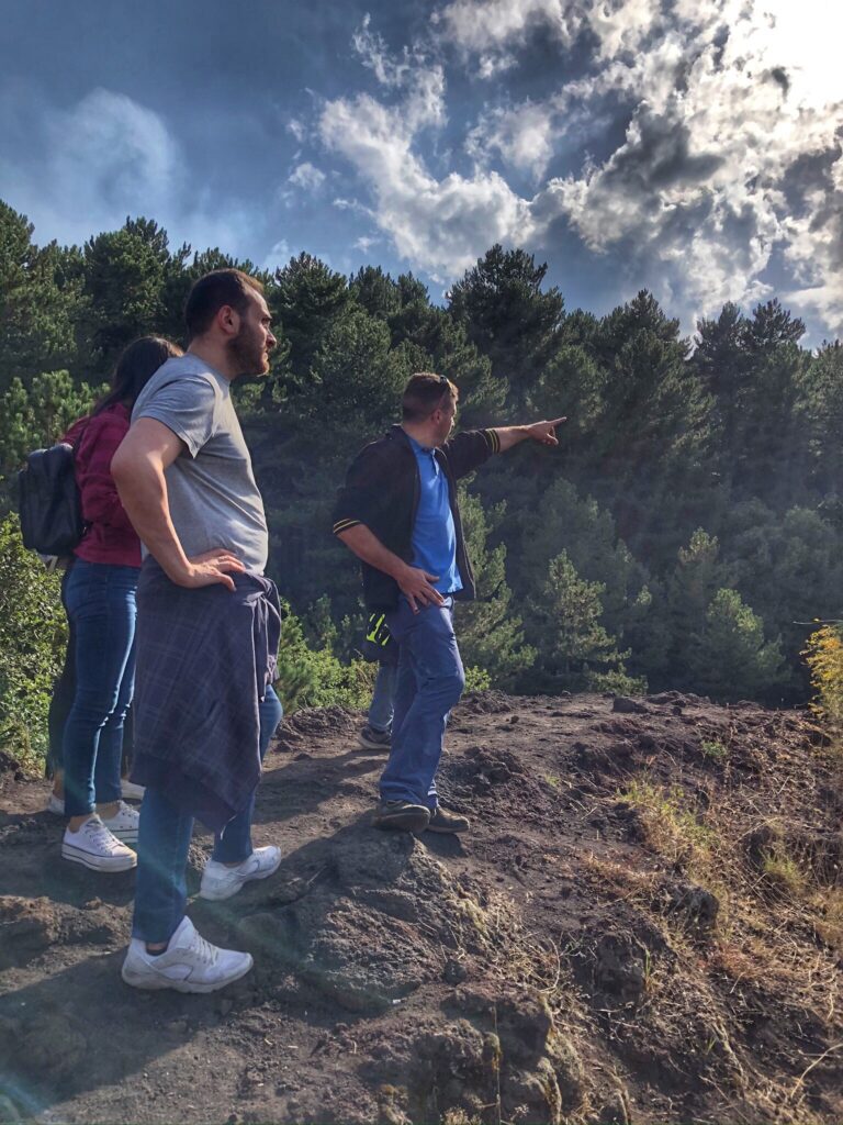 Parcheggiamo i quad e risaliamo un tratto di roccia vulcanica che ci porta ad uscire dal bosco e goderci la maestosità dell’Etna che purtroppo oggi s’intravede soltanto, a causa delle nuvole, ma la percezione che abbiamo qui è unica, un contrasto di colori, dal nero della roccia vulcanica, al verde della natura.