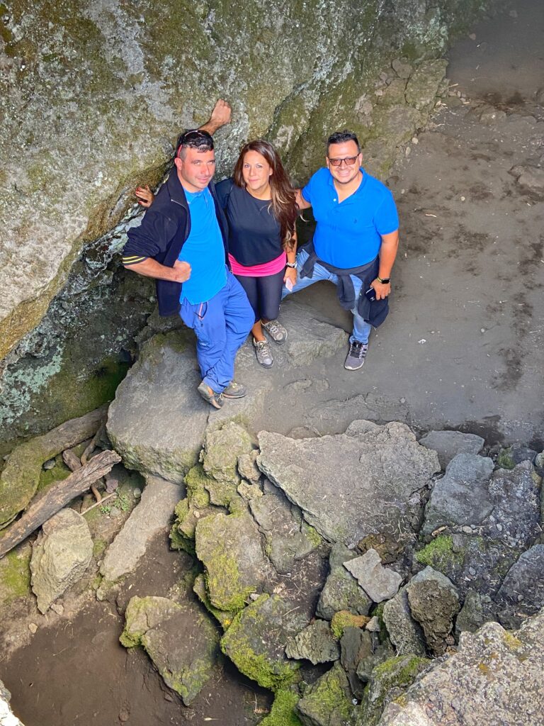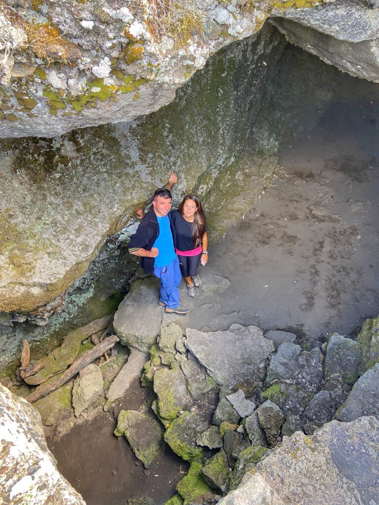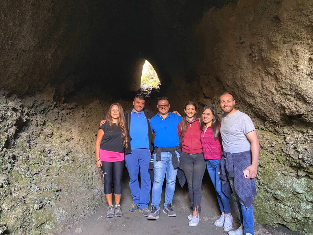 Altra sosta per visitare la “Grotta di Corruccio”. Percorriamo degli scalini naturali che ci permettono di addentrarci all’interno di questa galleria a scorrimento lavico, qualche informazione sul come una colata lavica particolarmente fluida può dare vita a delle vere opere d’arte e proseguiamo verso l’uscita. I quad ci aspettano ma Alessandro ci trattiene per farci notare che siamo sul bordo di un vecchio cratere e in queste rocce riusciamo a vedere i minerali che li compongono, dando vita a colorazioni diverse che brillano alla luce.