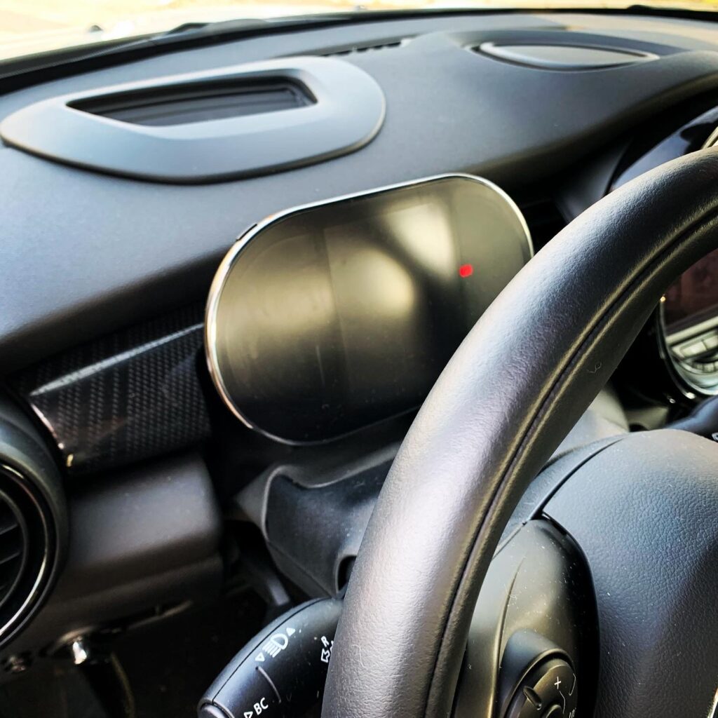 La Nuova MINI Full Electric è equipaggiata di serie con un quadro strumenti su misura per il modello, costituito da uno schermo a colori da 5,5 pollici nel design Black Panel posizionato dietro al volante. Al centro di questo schermo completamente digitale, la velocità di avanzamento è mostrata in numeri con una banda di scala laterale. La velocità viene inoltre visualizzata nel led ring dello strumento centrale: in rosso (modalità SPORT), bianco (MID) o verde (GREEN e GREEN +), in base alla modalità selezionata.