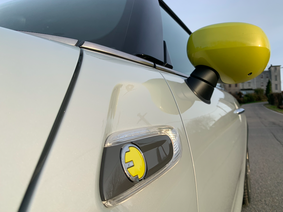Il logo MINI Electric in rilievo segnala il differente tipo di alimentazione. Le versioni gialle di questo logo appaiono sugli inserti degli indicatori di direzione laterali, noti come side scuttles, nonché sul portellone e sulla griglia anteriore del radiatore. L’elemento centrale della parte anteriore della MINI Full Electric presenta il caratteristico profilo esagonale, che però è chiuso poiché il motore elettrico richiede pochissima aria di raffreddamento. La barra decorativa gialla sulla griglia e sulle calotte degli specchietti esterni è rifinita nello stesso colore, conferendo così unicità al modello. La MINI Full Electric è equipaggiata di serie con i fari a LED.