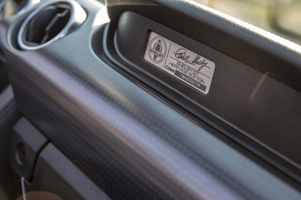 Oggi la Shelby GT-H rende omaggio a sè stessa e la consonante H prende il significato di Heritage. Una targhetta nell’abitacolo, davanti al sedile passeggero, riporta il numero di telaio della vettura assegnato dalla factory Shelby e certifica che si tratta, anche questa volta, di una produzione limitata. Ogni esemplare figura nel registro ufficiale della Marca americana, dove sono elencati tutti i modelli Shelby prodotti. Un’altra targhetta Shelby Tech, è posta nel vano motore.