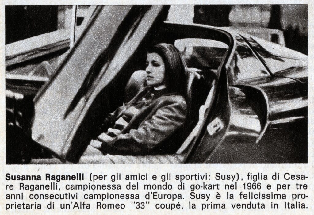 Forse l’unica donna a conquistare un campionato mondiale su quattro ruote fu la romana Susanna “Susy” Raganelli, che nel 1966 si aggiudicò il Campionato del Mondo di karting classe 100 cm3 sconfiggendo Leif Engstrom e il grande Ronnie Peterson. Raganelli legò per sempre il suo nome ad Alfa Romeo concludendo la sua carriera al volante di una GTA, ma fu anche la prima in Italia ad acquistare una leggendaria Alfa Romeo 33 Stradale del 1967, prodotta in appena 12 esemplari.