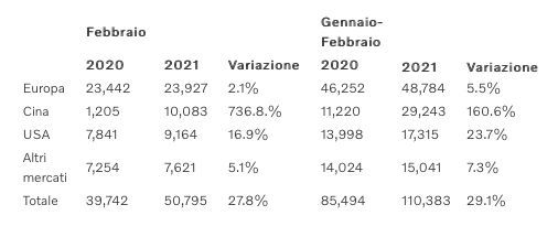 Le vendite totali durante il periodo considerato sono state pari a 110.383 unità, con volumi in crescita negli Stati Uniti, in Europa e in Cina. L’aumento delle vendite è stato trainato da una costante ripresa registrata in Cina dopo la pandemia da Covid-19 rispetto allo scorso anno, da un’ottima tenuta del mercato statunitense e da un aumento delle vendite in Svezia.