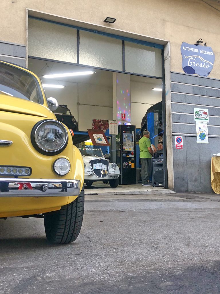 Dopo aver acceso il motore della mia Fiat 500 F del 1966 color avorio chiaro, che mi è stata regalata dai miei genitori nel 2014 in occasione del mio 30° compleanno, restaurata in seguito da mio padre e mio fratello in modo conservativo mantenendo il più possibile l’originalità del modello, mi avvio per raggiungere Rosario Strano del coordinamento di Giarre che ha Inaugurato in diretta con il Club, il punto amico di Mirco Grasso a Giarre (CT) con la presenza del sindaco Angelo d’Anna e le Fiat 500 dei fiduciari hanno fatto da scenografia all’officina meccanica, dov’era presente anche la Fiat 500 Gamine Vignale bianca del 1969 del coordinatore stesso, concludendo la serata con un momento conviviale davanti una buona pizza con vista sullo Jonio.