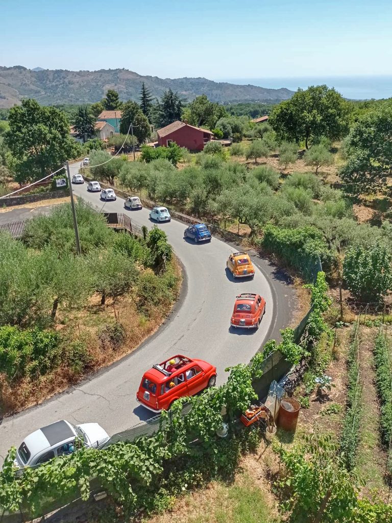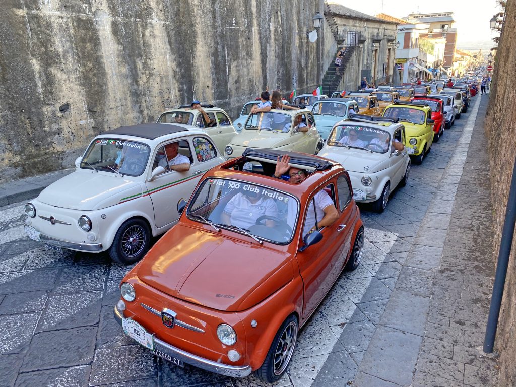 In parallelo nella stessa giornata abbiamo Davide Cappadonna fiduciario del coordinamento di Catania, su Autobianchi 500 Giardiniera color rosso corallo del 1971 che dopo aver riunito tutti i partecipanti presso piazza Sandro Pertini a Piano Tavola, inizia la colorata sfilata lungo le strade della città fino ad arrivare a Belpasso, la città delle 100 sculture, con la percezione di visitare un museo a cielo aperto, dove sculture in pietra lavica si ergono lungo la strada principale del paese. Sosta lungo la via Roma chiusa per l’occasione, all’altezza della XV strada per ammirare a piedi la nuova “Via dell’arte”.