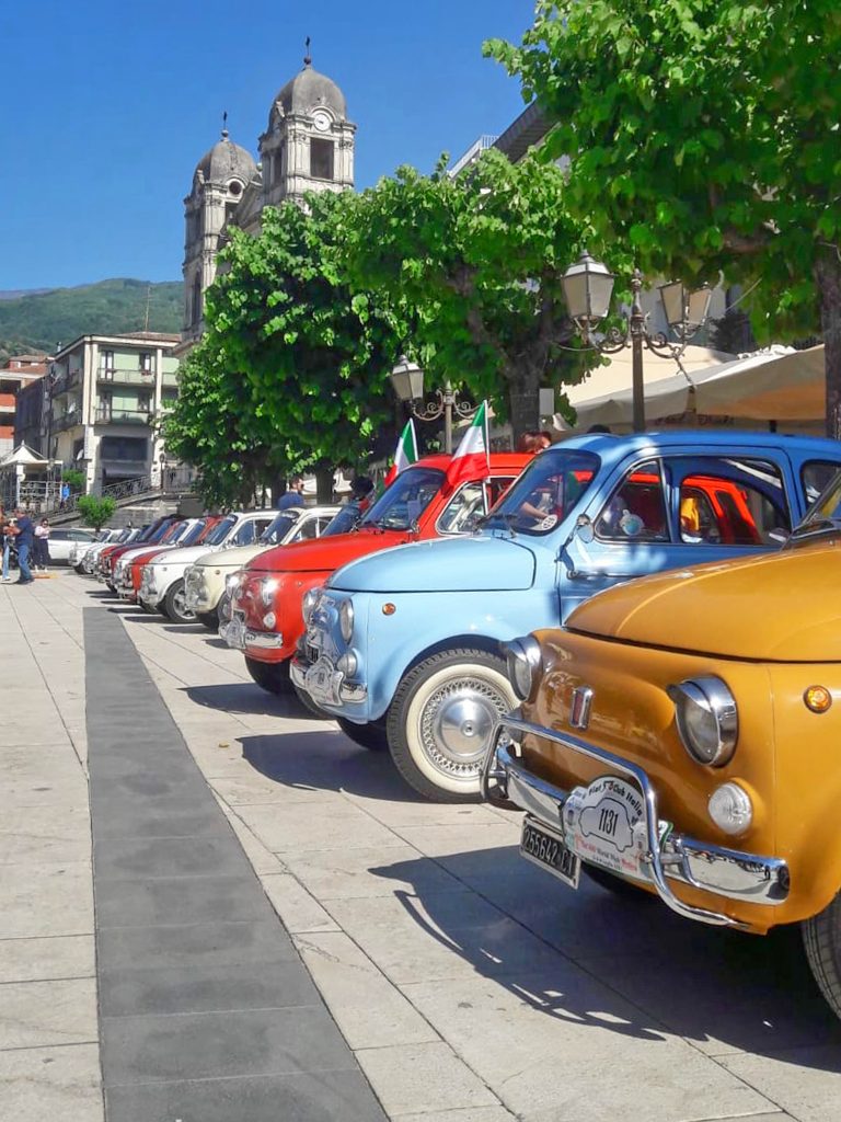 Radunate tutte le auto partecipati lungo la piazza Umberto I, situata tra la chiesa madre e la villa Belvedere che hanno fatto da scenografia alle piccole utilitarie, si mettono in moto le Fiat 500 in direzione Linguaglossa che hanno colorato la via principale del paese ….