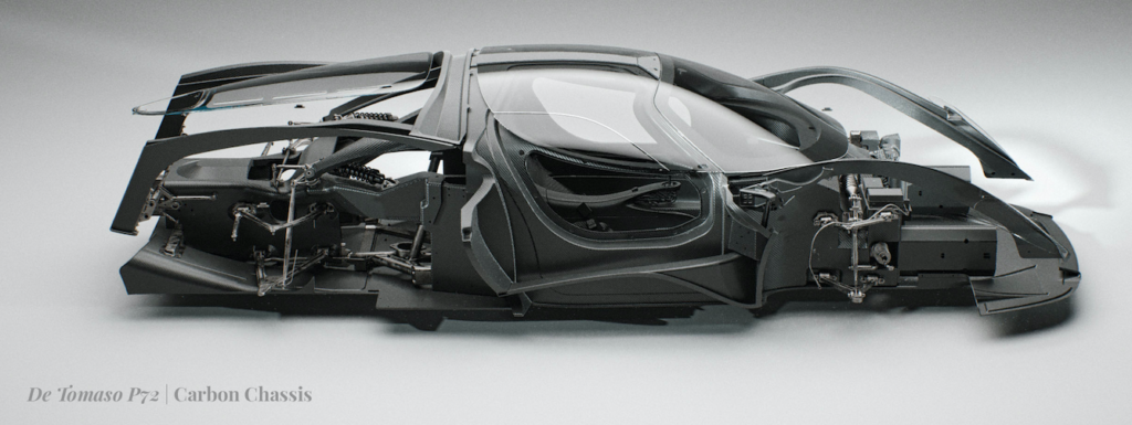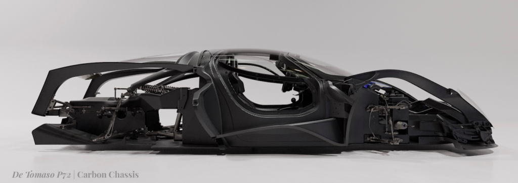 Il nostro intento originale era quello di utilizzare il telaio in carbonio che abbiamo sviluppato nei nostri progetti precedenti come base la supercar P72. Tuttavia, nel corso dello sviluppo abbiamo individuato aree su cui avevamo margini di miglioramento e questi rilievi ci hanno portato a sviluppare un nuovissimo telaio in carbonio che offre agli occupanti ulteriori 100 mm di spazio per le gambe e oltre 50 mm di spazio in altezza, aggiunti senza modificare le proporzioni esterne del veicolo pur rispettando i requisiti di omologazione. Il nostro telaio completamente nuovo e la geometria delle sospensioni non solo aumentano la sicurezza e garantiscono il massimo standard di qualità, ma abbassano notevolmente il baricentro (COG) della P72. Naturalmente, è stato co-sviluppato e costruito dai responsabili della Porsche 919 Le Mans Winning LMP1.