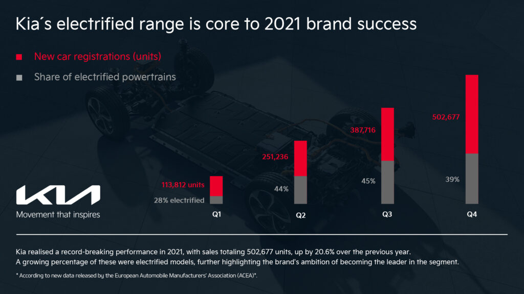 Il rilancio del marchio nel 2021 ha posto l’obiettivo per Kia di divenire, attraverso una gamma articolata di veicoli elettrificati e altamente ecologici, leader nella fornitura di soluzioni di mobilità sostenibile. Gli straordinari risultati comprendono, infatti, una quota decisamente in crescita di veicoli elettrificati, pari al 45% nel terzo trimestre.