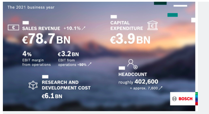 Nel complesso, il Gruppo Bosch ha affrontato bene le sfide del 2021“, ha affermato Forschner. “Siamo stati in grado di ottenere un aumento di fatturato del 10,1% facendo crescere il nostro EBIT operativo di oltre il 50%. Ciò è stato raggiunto nonostante la pandemia di coronavirus, ancora in corso, i persistenti problemi di approvvigionamento per i semiconduttori e l’aumento significativo dei prezzi delle materie prime“. Oltre ai buoni risultati, anche le misure di contenimento costi hanno dato i loro frutti“, ha spiegato Forschner. “Il nostro orientamento al futuro si riflette anche nel solido risultato finanziario“. Gli investimenti in ricerca e sviluppo del Gruppo Bosch sono rimasti stabili a 6,1 miliardi di euro (2020: 5,9 miliardi di euro) e le spese in conto capitale sono leggermente aumentate a 3,9 miliardi di euro (2020: 3,3 miliardi di euro). Gli investimenti in ricerca e sviluppo si sono concentrati sull’elettromobilità, sui sistemi di assistenza alla guida, ma anche sull’elettrificazione nell’industria e sulla tecnologia di riscaldamento. L’Equity ratio è migliorato ulteriormente di 1,3 punti, raggiungendo il 45,3%.