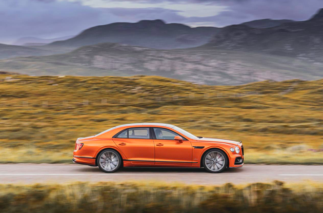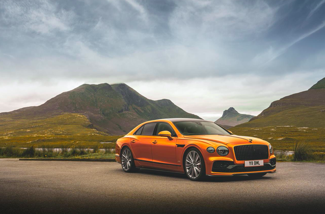 Il cerchio ruota dedicato Speed da 22″ è di serie, con finiture Dark Tint, Gloss Black e argento. È disponibile anche un secondo cerchio opzionale da 22″ dal design tipicamente sportivo, in Gloss Black o Pale Brodgar Satin. La Flying Spur Speed include anche i particolari tappi “gioiello” del serbatoio del carburante e dell’olio. Per amplificare ulteriormente l’essenza prestazionale della Speed, la Styling Specification di Bentley (splitter anteriore in fibra di carbonio, minigonne laterali, diffusore posteriore e sottile spoiler sul cofano del bagagliaio) e la Blackline Specification restano disponibili come optional. Con un equilibrio impareggiabile fra prestazioni e lusso, all’interno dell’abitacolo è stato adottata una nuova modo linea cromatica ed abbinamento di materiali che include l’uso di Dinamica per tutti i punti di contatto con il corpo degli occupanti. Bentley utilizza Dinamica Pure: la differenza rispetto alla Dinamica normale è che è realizzata con il 73% di poliestere riciclato. Per quanto riguarda la scelta passa oggi da cinque a quindici colori di pelle con impiallacciatura Piano Black di serie e Crown Cut Walnut, Dark Stained Burr Walnut o Dark Fiddleback Eucalyptus come opzioni alternative senza sovraprezzo.