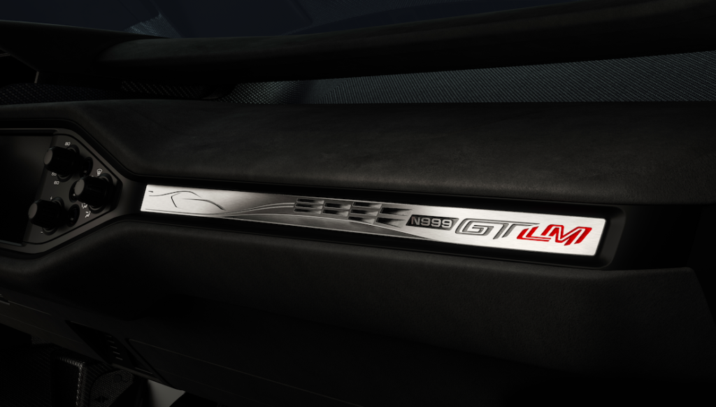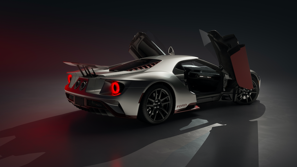 La carrozzeria è in fibra di carbonio laccata in Liquid Silver, mentre gli inserti Alcantara®, abbinati al carbonio e pelle, raccontano ricercatezza tecnica ed estetica, con dettagli sartoriali rosso-blu in onore alla livrea da gara rossa e blu della Ford GT numero 68 vincitrice a Le Mans.