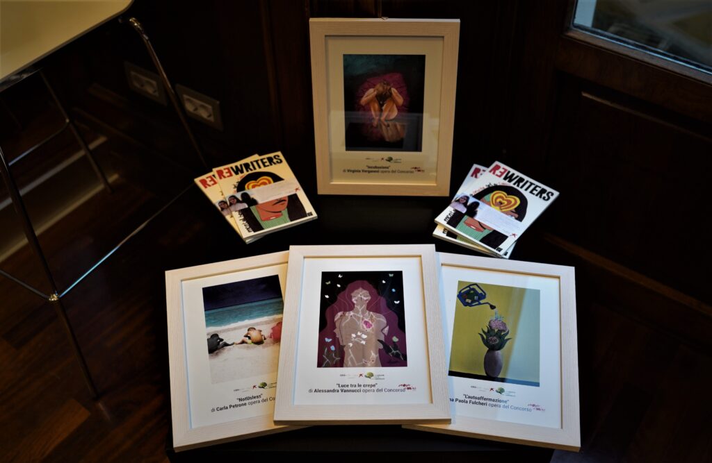 Spiegazione dell’opera d’arte “Luce tra le Crepe”: il pregiudizio porta a vergognarsi e nascondere le proprie fragilità. Lo smarrimento ed il vuoto provati possono diventare così forti da creare un profondo dolore, simboleggiato dalle crepe sul corpo della ragazza. Ad evidenziarne la sofferenza troviamo, in corrispondenza del suo cuore, un fiore piegato. Dalle crepe escono una luce e delle farfalle come messaggio di positività. La sofferenza va ascoltata e condivisa, senza alcuna vergogna, da qui la presenza di due mani tese verso la ragazza come gesto di aiuto. Ognuno, grazie alla luce della propria anima, potrà dare colore alle tenebre.