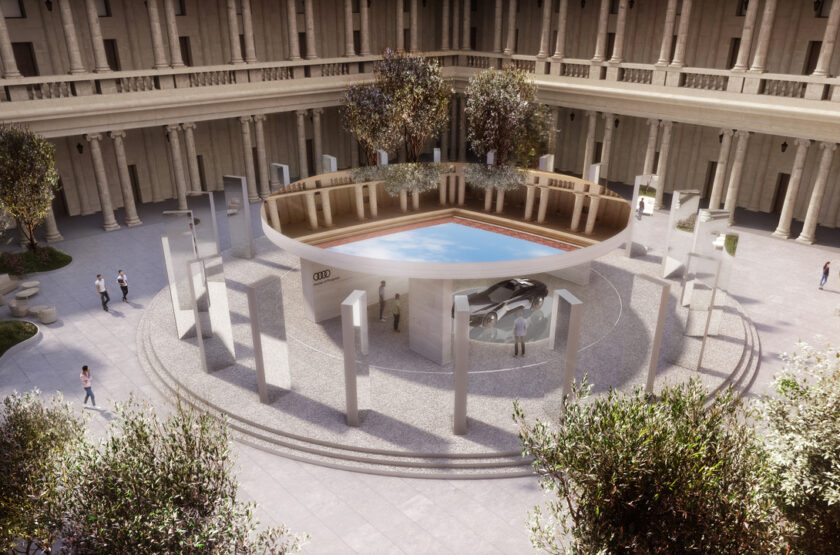 L’installazione, interpretazione del tema Design Re-Evolution, riprende il concetto di circular economy che sta alla base del progresso #audi, inteso come risparmio di risorse, conservazione e riciclo dei materiali durante la produzione. Vengono così rappresentati i cicli chiusi delle materie prime a elevato impatto energetico (alluminio, acqua, plastica, vetro, carta, acciaio), richiamati anche da display tattili presenti all’interno dell’installazione. Nel cortile, al centro dell’istallazione sarà esposta #audi skysphere concept, l’avveniristica roadster full electric dal passo variabile che farà il suo debutto in anteprima assoluta per il pubblico italiano, a simboleggiare come progresso tecnologico ed emozione possano nascere da un approccio totalmente sostenibile basato sull’economia circolare.