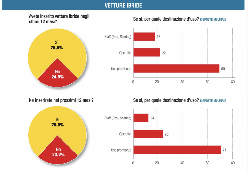 Pochi dubbi su ibride e full electric, ascoltando i manager che hanno già inserito queste tipologie di mezzi nelle proprie flotte. Ben l’81,3% dice che le vetture elettrificate hanno portato vantaggi nella loro adozione grazie a: 58% responsabilità sociale di impresa, 53% compliance con i valori aziendali, 34% agevolazioni alla mobilità per i propri dipendenti, a fronte di costi maggiori solo il 29% dice di aver ottenuto risparmi.  Quindi più marketing, pochi risparmi.