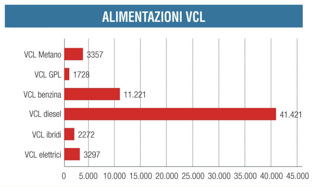 Nei veicoli commerciali la via dell’elettrificazione appare ancora più lunga, con la presenza di 41.421 unità con alimentazione diesel e 11.221 a benzina, cui segue il metano con 3.357 unità, tallonato dai full electric presenti nelle flotte con 3.297 veicoli commerciali.