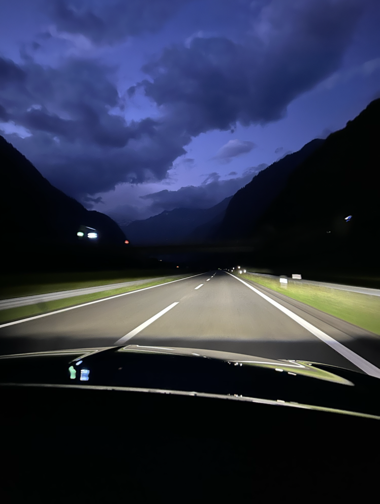 Viaggio che ha incluso alcuni imprevisti sulla strada, quindi è cominciato con il percorrere tutta la statale del San Bernardino incluso il passo, il tutto dopo le 22:00 e dopo un temporale, quindi strada stretta, tortuosa, bagnata e buia.