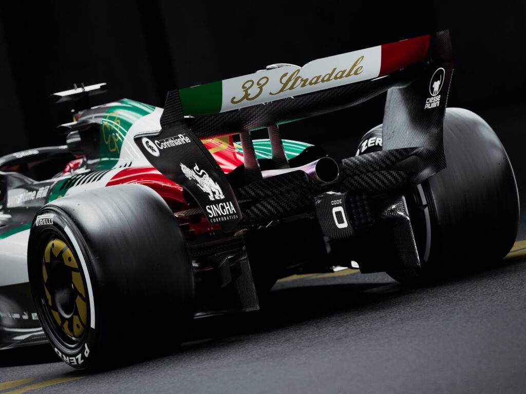 Inoltre, sulle monoposto di Valtteri Bottas e Zhou Guanyu i colori della bandiera italiana, presente sulla parte del cofano motore, sono stati virati al verde “Quadrifoglio” con il bianco a completare il rosso della livrea ufficiale. Il vessilo, dominante sulla fiancata della vettura, prende vita grazie all’andamento fortemente diagonale e dona ancor più dinamicità alla percezione della monoposto.